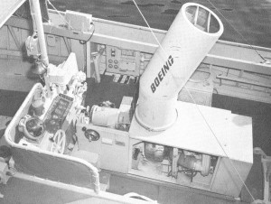 The first photo shows the 36′ MSL being tested following installation of Boeing Gas Turbine engines 502-10C and outfitted with all its gear at the Seattle shipyard in the mid-late 1950′s. Note the hull numbers have not been painted on the bow and stern yet. The photo below is a close up of the Boeing 502-10C main propulsion engine: