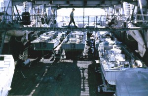 MSL’s on wheeled skids in the well deck of U.S.S. Epping Forest. The Epping Forest, LSD-4 in Korea, re-designated MCS-7 in 1961 when she was transferred to MINPAC as Mine Countermeasures Support ship = MCS. The same mine sweeping mother ship duties that approximately17 LSD’s performed in Korea.